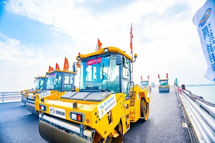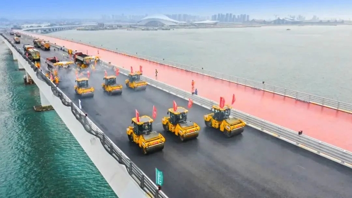 翔安大桥在建设中既要克服海上风浪大、潮差高、岩层强度高、跨越生态保护区等困难,又要兼顾绿色环保;要在这种复杂的环境中保证施工质量,对设备和施工技术的选择就显得尤为重要。开云线上登录数字化智能施工集群凭借其智能化、高精度、高效率等显著优势,成功克服了传统施工方式难以应对的诸多难题,可精准适配翔安大桥的桥面铺装工作。