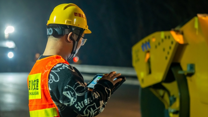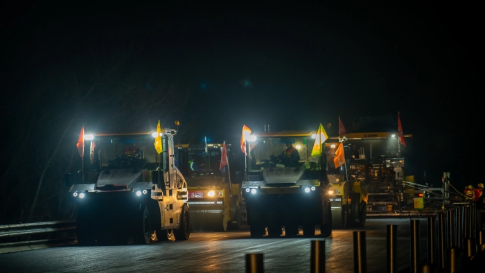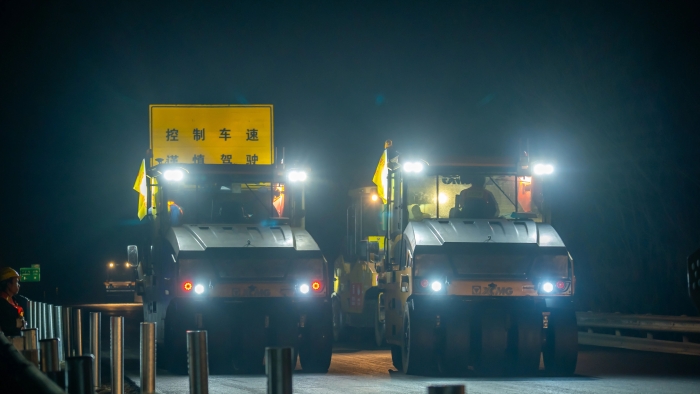 施工现场采用了智能摊铺碾压技术,通过加装在摊铺机、压路机上的北斗高精度定位系统、惯性导航系统和可视化等智能技术,实现了24小时协同作业,与传统路面摊铺相比,施工效率提高了33%。而且在智能化的加持下,更实现自动变道、自动避障,碾压精度控制在0.5cm。