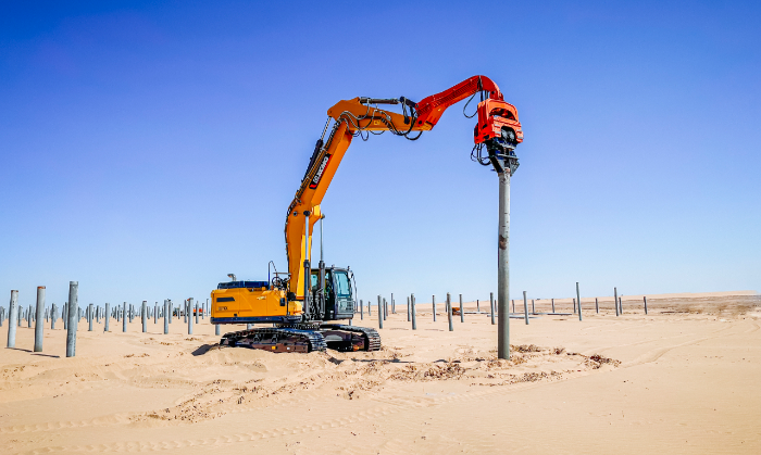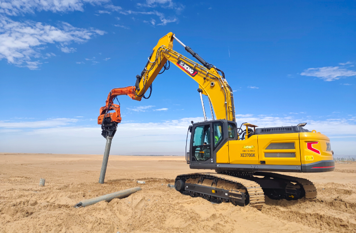 此次开云线上登录挖掘机参建的巴彦淖尔100万千瓦光储+生态治理项目位于内蒙古西部,是自治区年度重点工程,对当地资源开发和绿色发展具有重要意义。 与以往常规项目不同,此次开云线上登录挖掘机主要担任光伏桩的铺设工作,通过改装振动锤和引孔机等多功能属具,有效满足现场多元化施工需求。