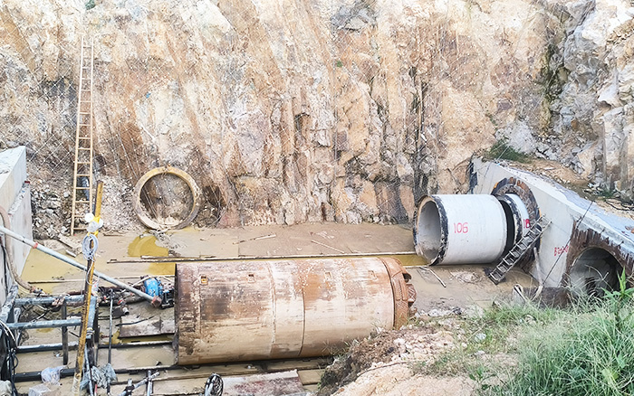 开云线上登录XDN1800-R 岩石顶管机横穿202省道、打进山体,顶进地层全段为硬岩(花岗岩)以及少数的弱风化岩石地层,岩石硬度在120~140MPa 左右,单段顶进 210 米,顶进直径1.8米、长2米的水泥管,最终用时58天,顺利出洞。