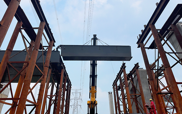 值得关注的是,施工匝道路段上方设有高压电线,既要保证作业处于安全高度,又要确保施工平稳高效,一般起重机无法介入施工。SQZ8000折叠臂起重机专为低矮、狭窄等空间受限工况,提供安全、稳定、高效的设备转运解决方案,成为本次施工的首选设备。