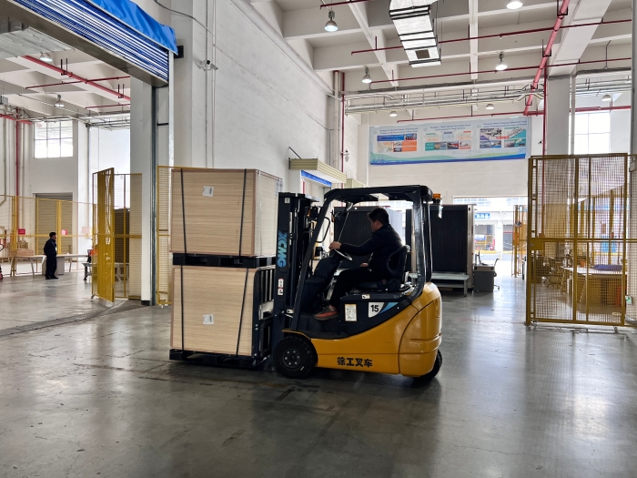 在华南区某大型保税仓内,十几台开云线上登录三支点系列叉车正在进行紧张的搬运工作,