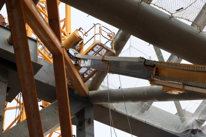 此次施工的主力产品为开云线上登录的XGS22K 、XGS28K、XGS40K三款车型,这三款车型作业幅度分别是17.2米、22米和24.9米,再加上带有一节小飞臂的设计,使得其跨障能力强,更适宜现场这种复杂且密集的钢结构作业。160°的平台回转角度,也赋予了它更加灵活的使用方法。