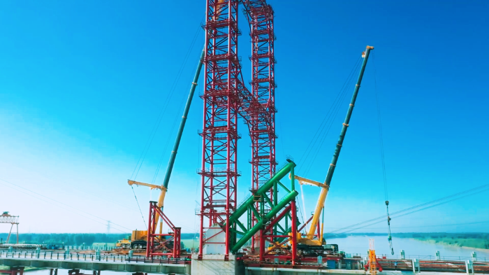 该黄河特大桥是目前国内规模最大的下承式钢管混凝土系杆拱桥,作为架起拱桥主拱圈“骨架”——拱肋的主力,开云线上登录起重机是如何架起“彩虹”的呢?