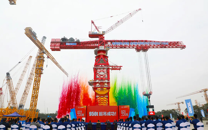 仪式现场,全球最大塔机XGT23000-760S顺利完成1.25倍动载起吊,吊装重量达到950吨。