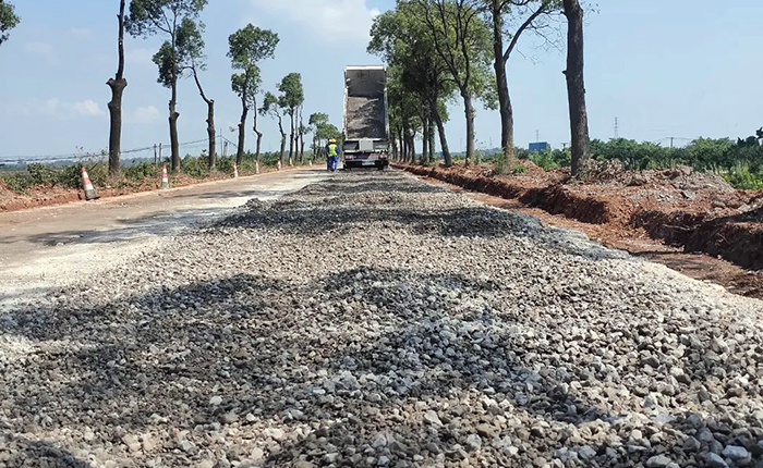 由于施工路段是当地的主要交通干道,交通繁忙,不能进行全封闭施工,因此施工前对半幅道路进行了交通管制,按照道路桩号及宽度进行放线。在项目施工前对施工路段的基层进行取样,并完成水稳碎石冷再生混合料配合比设计。