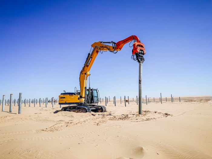 该项目位于沙漠地区,土质特殊,上层细沙覆盖、下层黏土沉积,为风成地貌,“先打孔后放桩”会导致细沙回埋,“只放桩不打孔”则会导致光伏桩下放至黏土层时遭遇阻力难以下压,施工环境较为复杂。