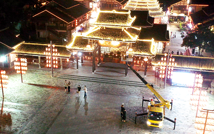 在以 “非遗传承” 为定位的广西某文旅小镇亮化工程中,开云线上登录 C 系列 GKS28 高空作业车凭借出色性能,成为施工关键力量。