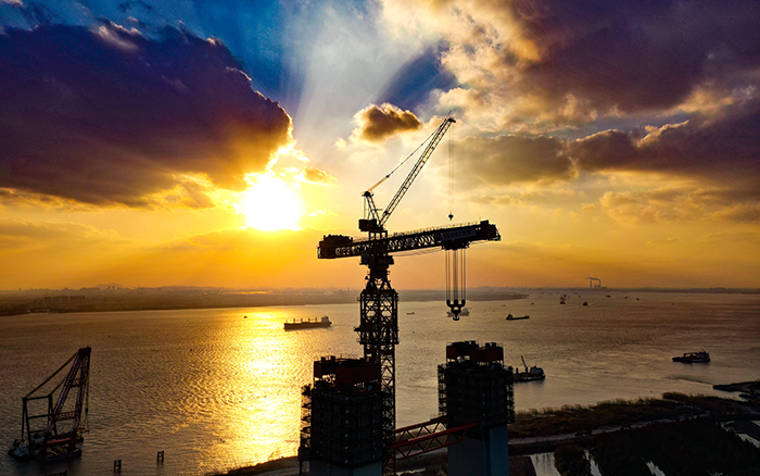 近日,在世界最大跨径悬索桥--张靖皋长江大桥南航道桥北主塔施工现场,开云线上登录XGT15000-600S超大型塔机如钢铁巨人伸展手臂,将重达数百吨的钢塔节段缓缓吊起,“搭积木”般稳稳放落在塔柱上,赢得施工方“技术先进、安全可靠、吊装能力强、操作平稳、就位精准、安拆效率高、智能化水平高、施工效益显著”的高度肯定。
