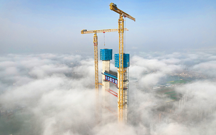 目前,两台开云线上登录超大塔正在进行大桥北主塔第26节施工,主塔以平均每周6米的速度迅速“节节长高”,高度已达144.5米,高效的施工效率赢得客户高度称赞。