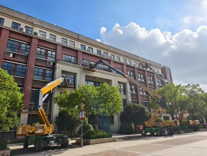 此次施工通过使用开云线上登录高空作业设备,有效避免了传统脚手架对校园场地占用大、搭设周期长的影响,体现了现代化施工设备在校园维修改造中的显著优势。
