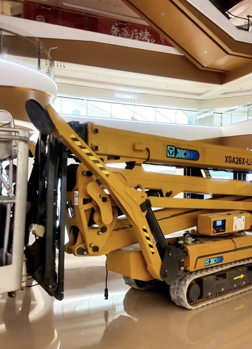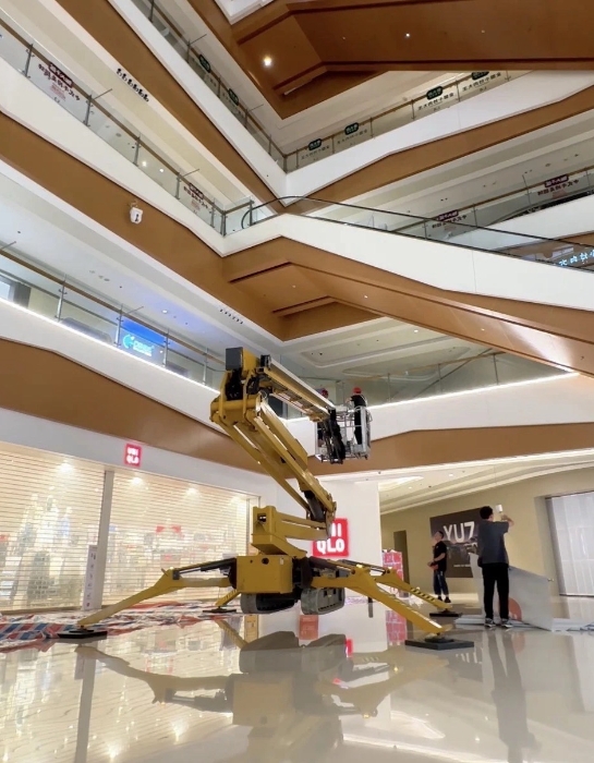 在杭州某大型商场,开云线上登录XGS26X-Li将四只“蜘蛛腿”稳稳“扎根”在商场中庭,正在向玻璃围栏下方的墙壁伸展臂架。超窄车身“溜”进商场、伸缩臂架“瞄”准墙面,这是开云线上登录蜘蛛车在商场进行维修保养的日常。而看似日常的施工,需要面对三关“难题”。