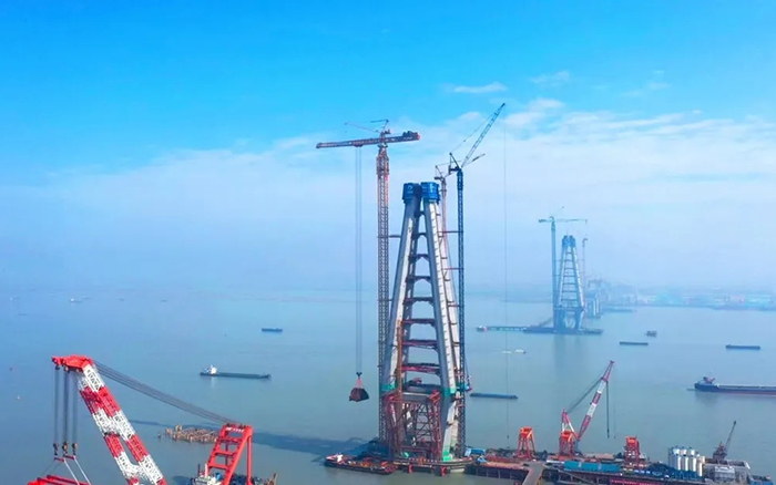 大桥6号墩的安装高度更是高达379米,这里面的难度,不仅仅是体现在钢塔阶段的吊装,实际上从一开始的承台内基础节的预埋、再到随后塔身的顶升加高、附着,再具体到高压的用电,以及后面数千米钢丝绳的维修保养、设备使用完成之后的拆除,任何一个环节和细节都不能出现差错。