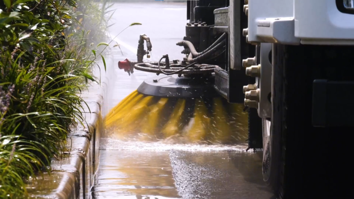 产业区周边道路:运输车辆频繁出入,易产生碎屑、油污。洗扫车搭载的高压水枪与V型喷杆,可对路面进行深度冲洗,油污去除率超95%,避免二次污染。