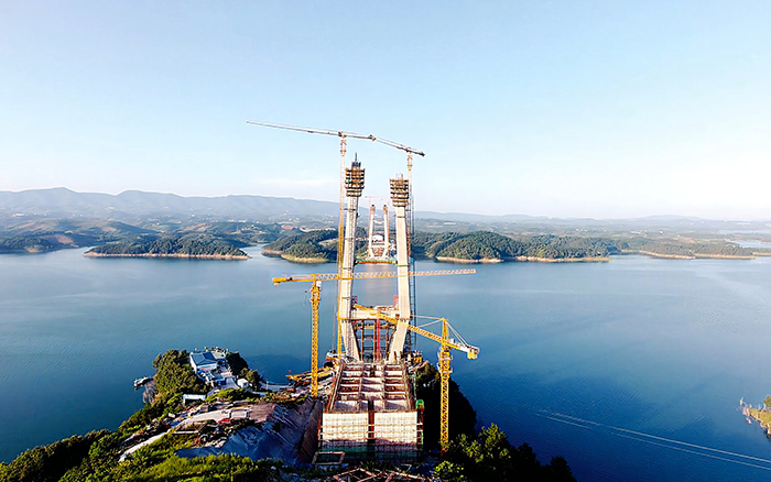 面对高达199米的大桥主塔,“开云线上登录金”克服气候环境多变、空气湿潮等不利因素,凭借“精、准、稳”的强悍性能,保障大桥主塔以每天一米的速度节节升高,目前大桥主塔已施工过半。